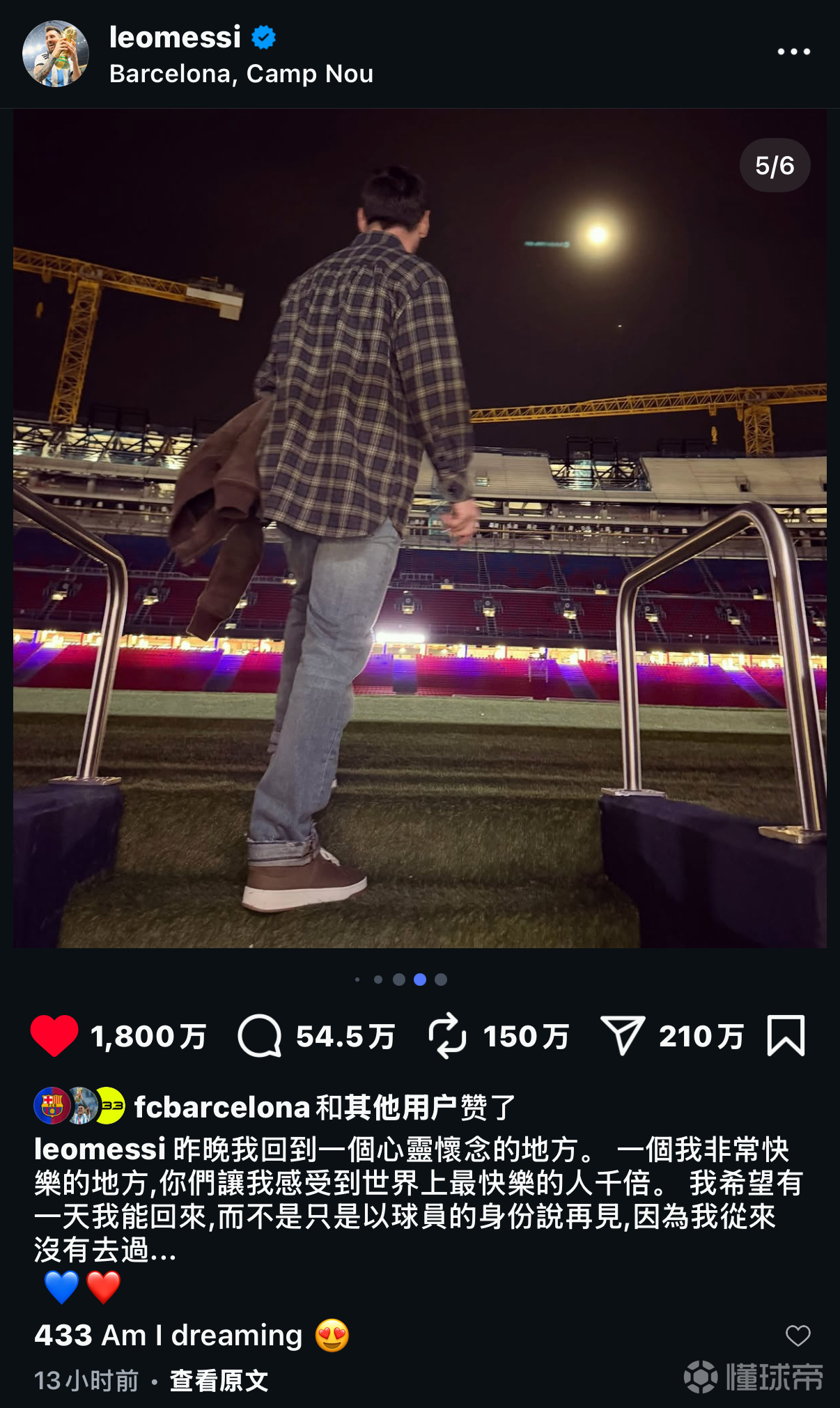 梅西在回家途中顺道重返了巴萨的诺坎普球场,这一举动收获了1800万的点赞量。巴萨对于梅西而言,就如同家一般温暖,待到时机成熟,他自会归来。——————今年巴萨将迎来选举,拉波尔塔近期似乎已陷入困境,时而假装购买球星以造势,时而又提出新建球场以向梅西致敬。若梅西能在巴萨现任高层毫不知情的情况下回来看看,那也算是给拉波尔塔一个有力的回应,让他别再借机炒作。——————巴萨并非属于任何一位高层,而是属于